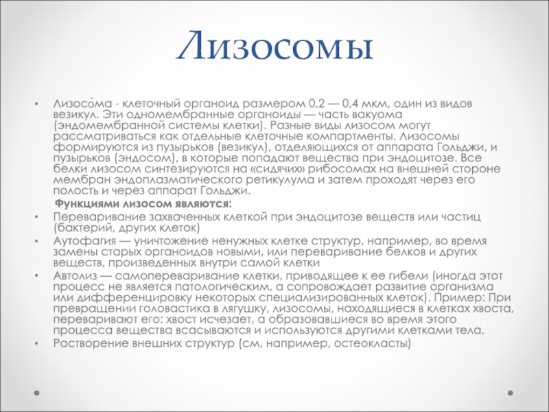 видов везикул. Эти одномембранные органоиды — часть вакуома (эндомембранной системы клетки). Разные виды лизосом могут рассматриваться как отдельные клеточные компартменты. Лизосомы формируются из пузырьков (везикул), отделяющихся от аппарата Гольджи, и пузырьков (эндосом), в которые попадают вещества при эндоцитозе. Все белки лизосом синтезируются на «сидячих» рибосомах на внешней стороне мембран эндоплазматического ретикулума и затем проходят через его полость и через аппарат Гольджи.