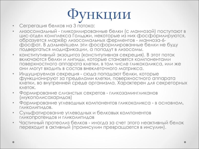 поступают в цис-отдел комплекса Гольджи, некоторые из них фосфорилируются, образуется маркёр лизосомальных ферментов - манноза-6-фосфат. В дальнейшем эти фосфорилированные белки не буду подвергаться модификации, а попадут в лизосомы.