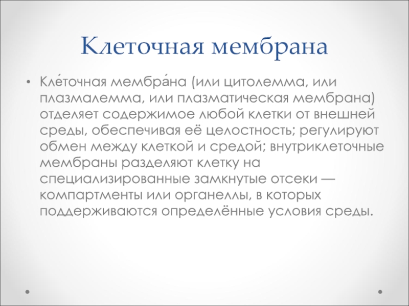 Кле́точная мембра́на (или цитолемма, или плазмалемма, или плазматическая мембрана) отделяет