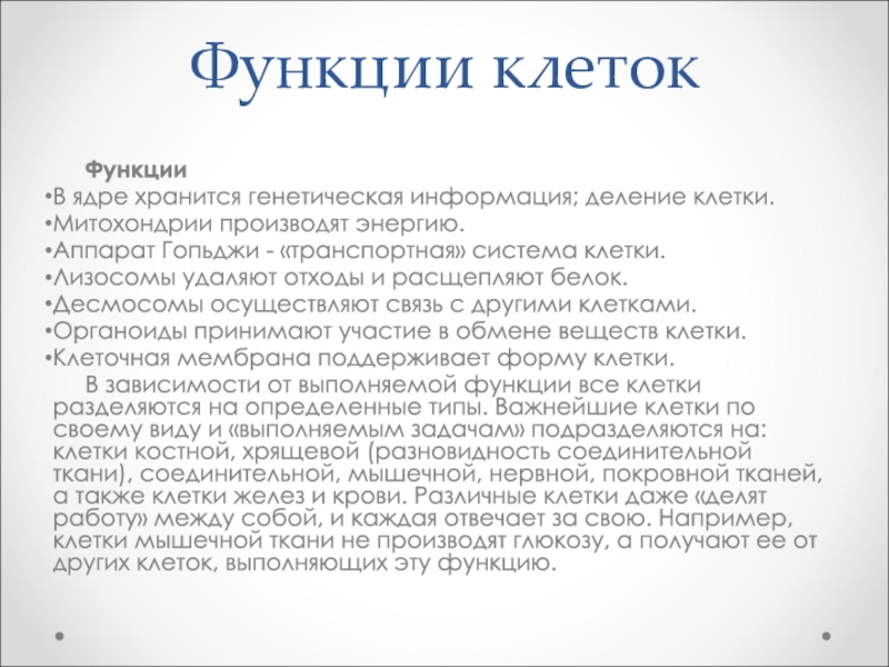 В зависимости от выполняемой функции все клетки разделяются на определенные типы. Важнейшие клетки по своему виду и «выполняемым задачам» подразделяются на: клетки костной, хрящевой (разновидность соединительной ткани), соединительной, мышечной, нервной, покровной тканей, а также клетки желез и крови. Различные клетки даже «делят работу» между собой, и каждая отвечает за свою. Например, клетки мышечной ткани не производят глюкозу, а получают ее от других клеток, выполняющих эту функцию.