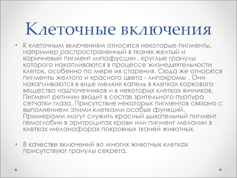 К клеточным включениям относятся некоторые пигменты, например распространенный в тканях