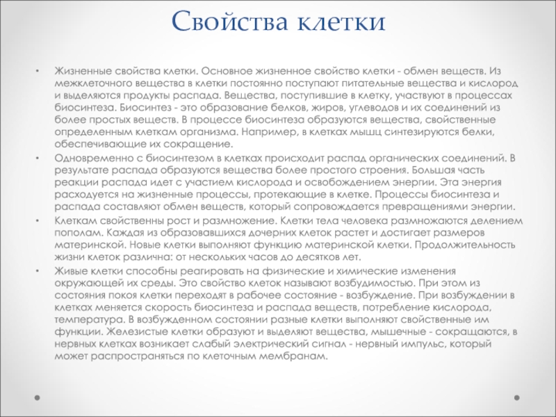 Живые клетки способны реагировать на физические и химические изменения окружающей их среды. Это свойство клеток называют возбудимостью. При этом из состояния покоя клетки переходят в рабочее состояние - возбуждение. При возбуждении в клетках меняется скорость биосинтеза и распада веществ, потребление кислорода, температура. В возбужденном состоянии разные клетки выполняют свойственные им функции. Железистые клетки образуют и выделяют вещества, мышечные - сокращаются, в нервных клетках возникает слабый электрический сигнал - нервный импульс, который может распространяться по клеточным мембранам.