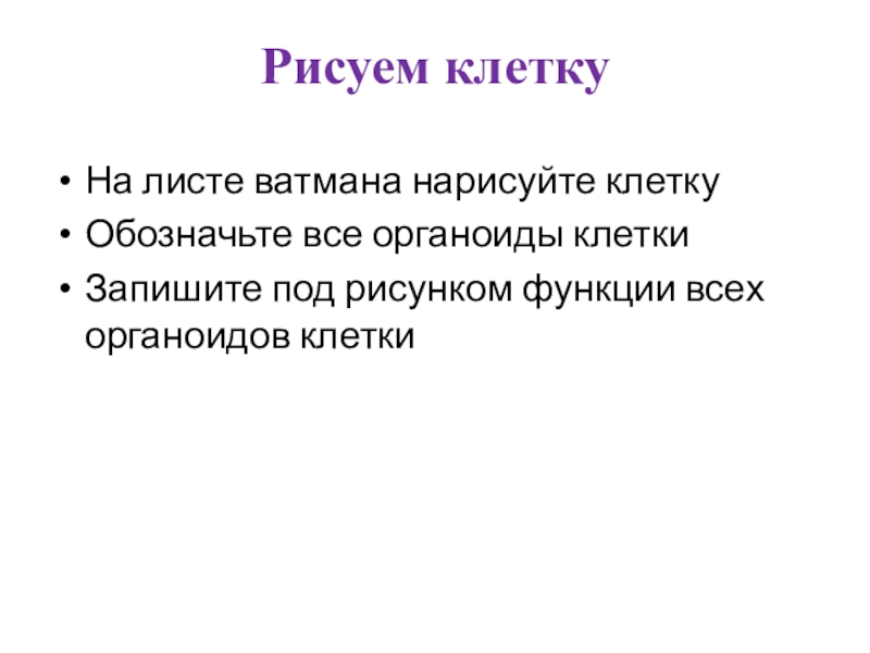 Рисуем клеткуНа листе ватмана нарисуйте клеткуОбозначьте все органоиды клеткиЗапишите под рисунком функции всех органоидов клетки