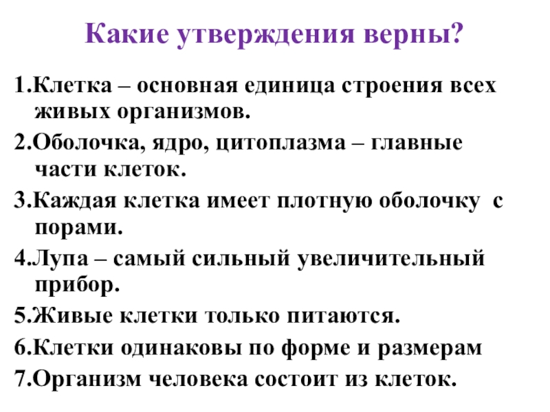 Какие утверждения верны?1.Клетка – основная единица строения всех живых организмов.2.Оболочка, ядро, цитоплазма – главные части клеток.3.Каждая клетка
