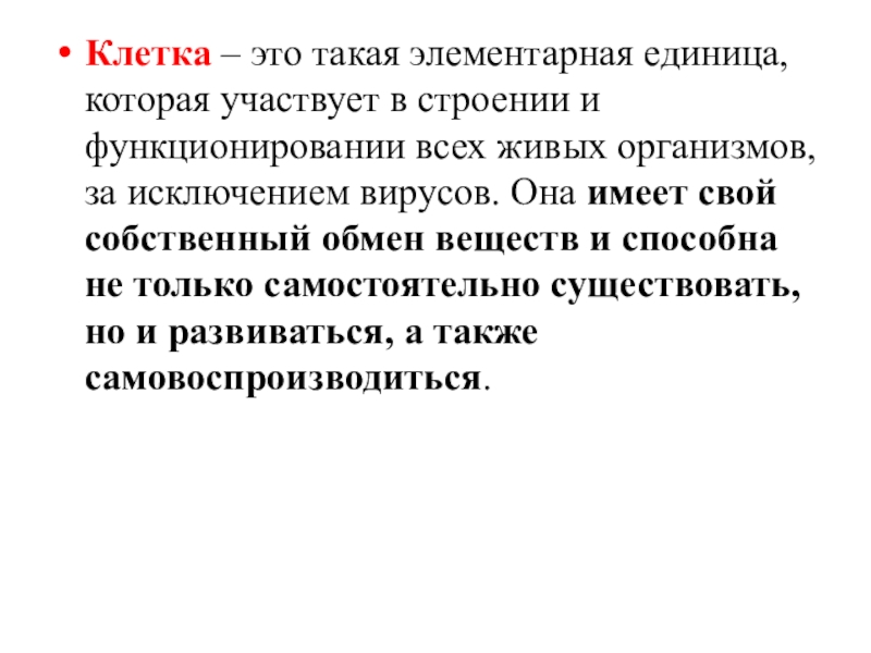функционировании всех живых организмов, за исключением вирусов. Она имеет свой собственный обмен веществ и способна не только самостоятельно существовать, но и развиваться, а также самовоспроизводиться.