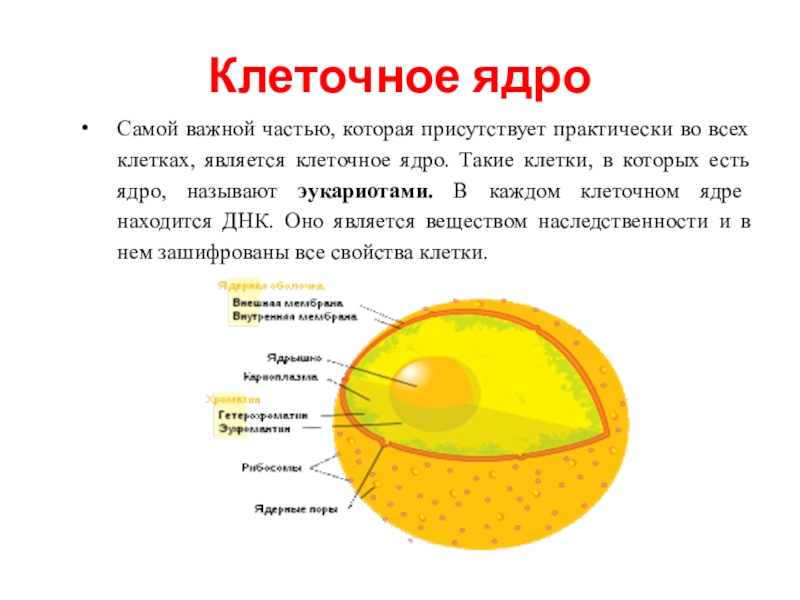 клеточное ядро. Такие клетки, в которых есть ядро, называют эукариотами. В каждом клеточном ядре находится ДНК. Оно является веществом наследственности и в нем зашифрованы все свойства клетки.