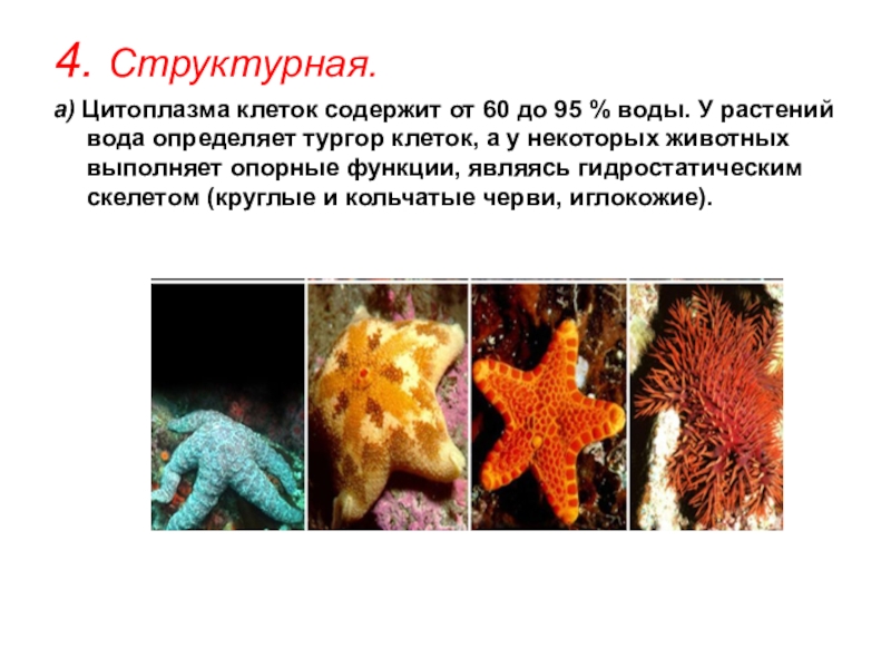 воды. У растений вода определяет тургор клеток, а у некоторых животных выполняет опорные функции, являясь гидростатическим скелетом (круглые и кольчатые черви, иглокожие).