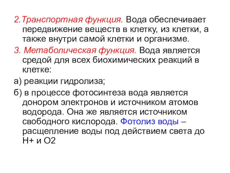 Слайд 262.Транспортная функция. Вода обеспечивает передвижение веществ в клетку, из клетки, а