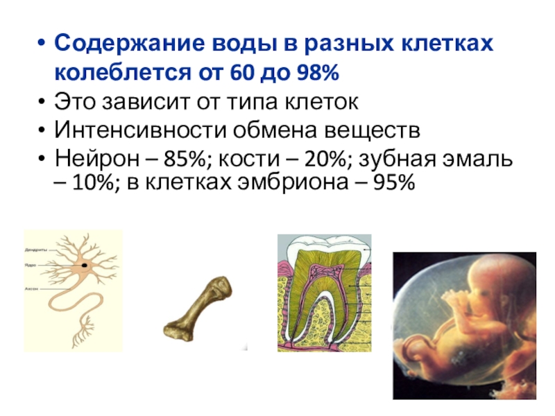 Нейрон – 85%; кости – 20%; зубная эмаль – 10%; в клетках эмбриона – 95%