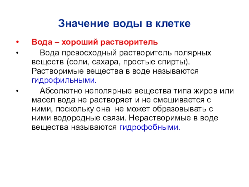 Абсолютно неполярные вещества типа жиров или масел вода не растворяет и не смешивается с ними, поскольку она не может образовывать с ними водородные связи. Нерастворимые в воде вещества называются гидрофобными.