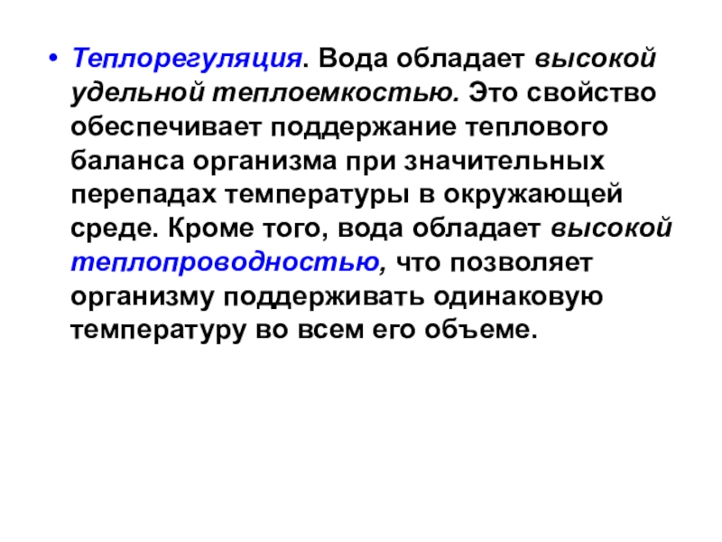 баланса организма при значительных перепадах температуры в окружающей среде. Кроме того, вода обладает высокой теплопроводностью, что позволяет организму поддерживать одинаковую температуру во всем его объеме.