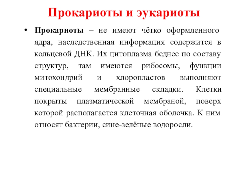 содержится в кольцевой ДНК. Их цитоплазма беднее по составу структур, там имеются рибосомы, функции митохондрий и хлоропластов выполняют специальные мембранные складки. Клетки покрыты плазматической мембраной, поверх которой располагается клеточная оболочка. К ним относят бактерии, сине-зелёные водоросли.