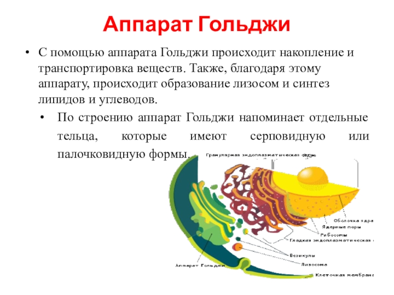 благодаря этому аппарату, происходит образование лизосом и синтез липидов и углеводов.