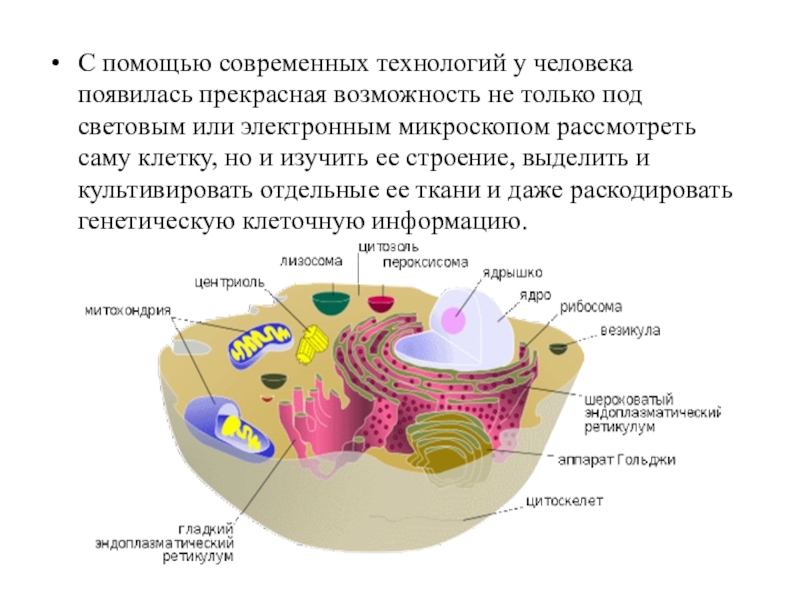 под световым или электронным микроскопом рассмотреть саму клетку, но и изучить ее строение, выделить и культивировать отдельные ее ткани и даже раскодировать генетическую клеточную информацию.