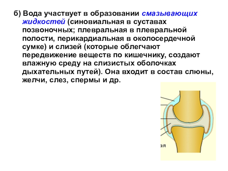Слайд 28б) Вода участвует в образовании смазывающих жидкостей (синовиальная в суставах позвоночных;