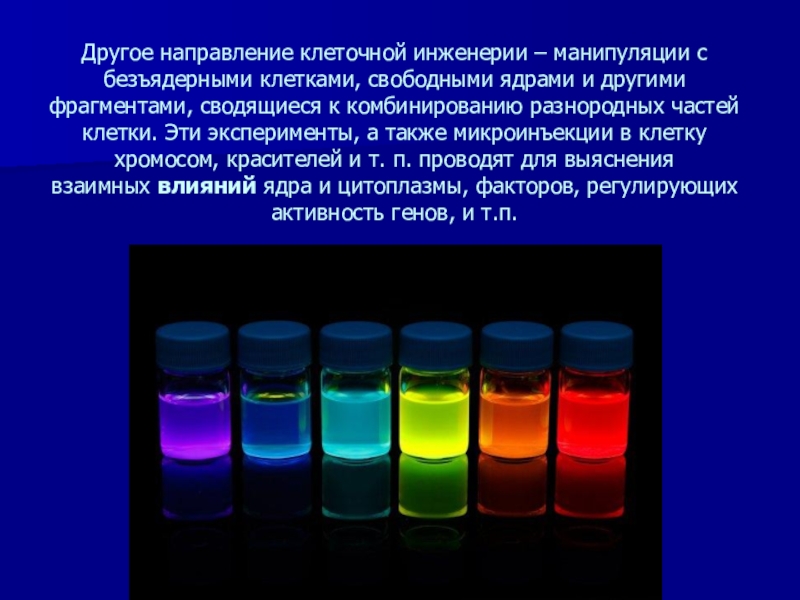 и другими фрагментами, сводящиеся к комбинированию разнородных частей клетки. Эти эксперименты, а также микроинъекции в клетку хромосом, красителей и т. п. проводят для выяснения взаимных влияний ядра и цитоплазмы, факторов, регулирующих активность генов, и т.п.