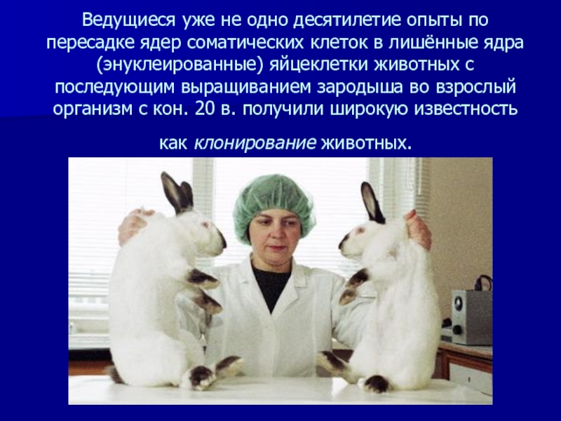 Слайд 7Ведущиеся уже не одно десятилетие опыты по пересадке ядер соматических клеток