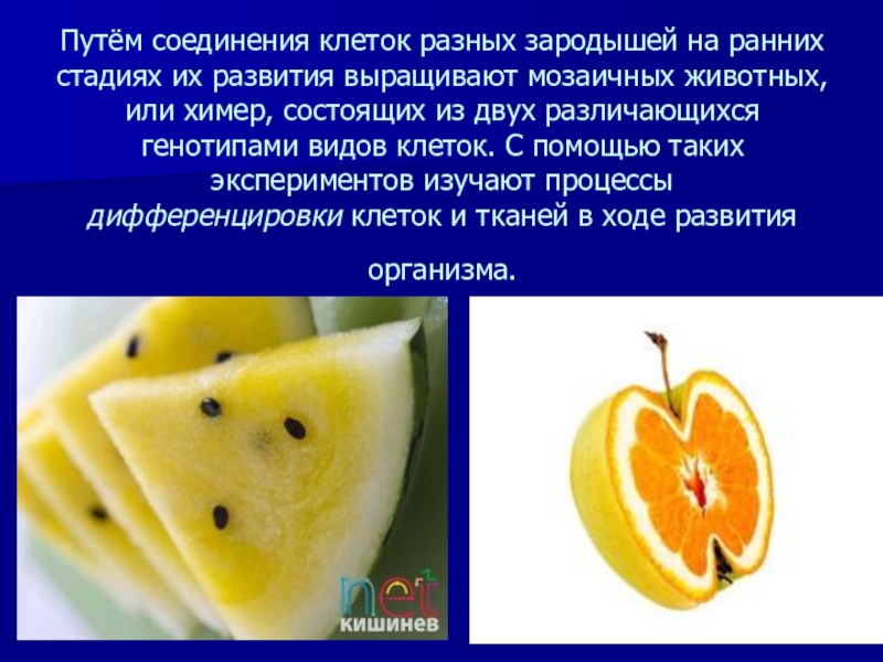мозаичных животных, или химер, состоящих из двух различающихся генотипами видов клеток. С помощью таких экспериментов изучают процессы дифференцировки клеток и тканей в ходе развития организма.