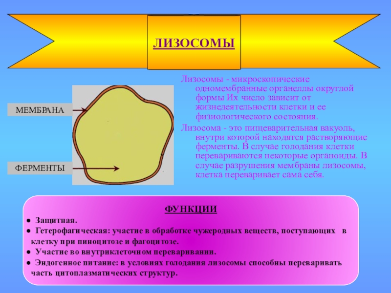 Эндогенное питание: в условиях голодания лизосомы способны переваривать часть цитоплазматических структур.