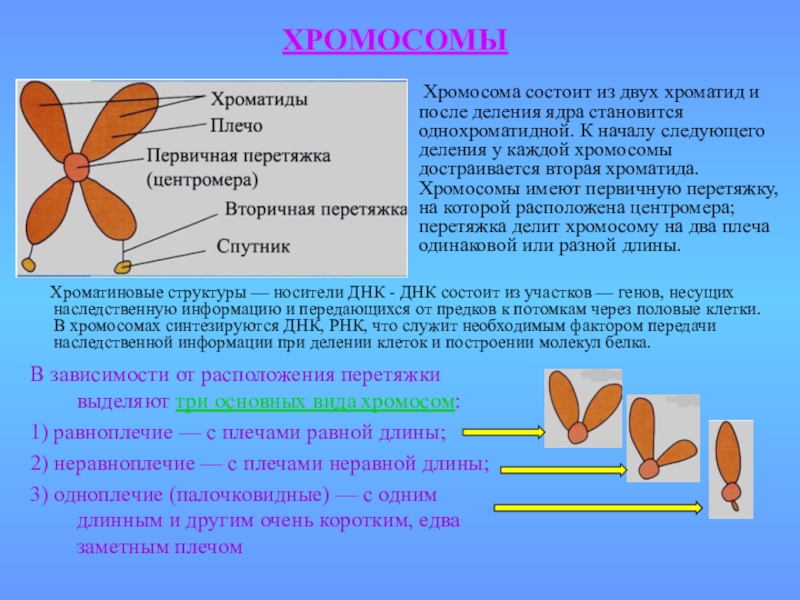 В зависимости от расположения перетяжки выделяют три основных вида хромосом: