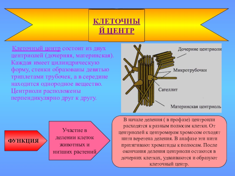 В начале деления ( в профазе) центроили расходятся к разным полюсам клетки. От центриолей к центромерам хромосом отходят нити веретена деления. В анафазе эти нити притягивают хроматиды к полюсам. После окончания деления центриоли остаются в дочерних клетках, удваиваются и образуют клеточный центр.