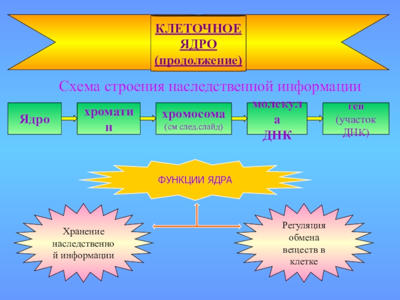 Хроматиновые структуры — носители ДНК - ДНК состоит из участков — генов, несущих наследственную информацию и передающихся от предков к потомкам через половые клетки. В хромосомах синтезируются ДНК, РНК, что служит необходимым фактором передачи наследственной информации при делении клеток и построении молекул белка.