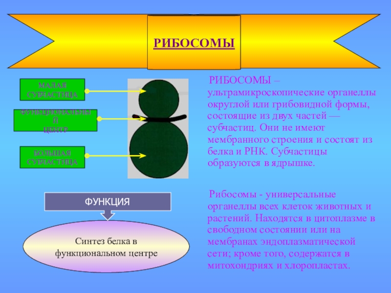 Рибосомы - универсальные органеллы всех клеток животных и растений. Находятся в цитоплазме в свободном состоянии или на мембранах эндоплазматической сети; кроме того, содержатся в митохондриях и хлоропластах.