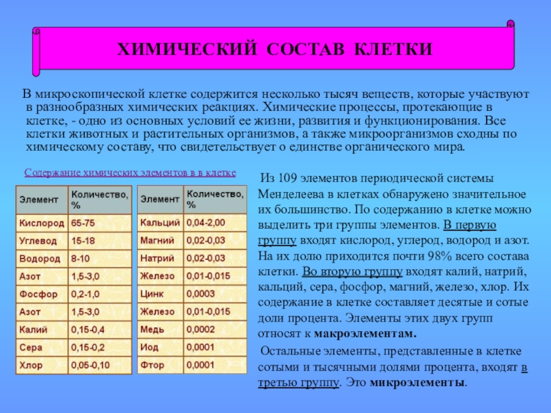 Из 109 элементов периодической системы Менделеева в клетках обнаружено значительное их большинство. По содержанию в клетке можно выделить три группы элементов. В первую группу входят кислород, углерод, водород и азот. На их долю приходится почти 98% всего состава клетки. Во вторую группу входят калий, натрий, кальций, сера, фосфор, магний, железо, хлор. Их содержание в клетке составляет десятые и сотые доли процента. Элементы этих двух групп относят к макроэлементам.