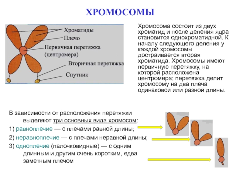 В зависимости от расположения перетяжки выделяют три основных вида хромосом: