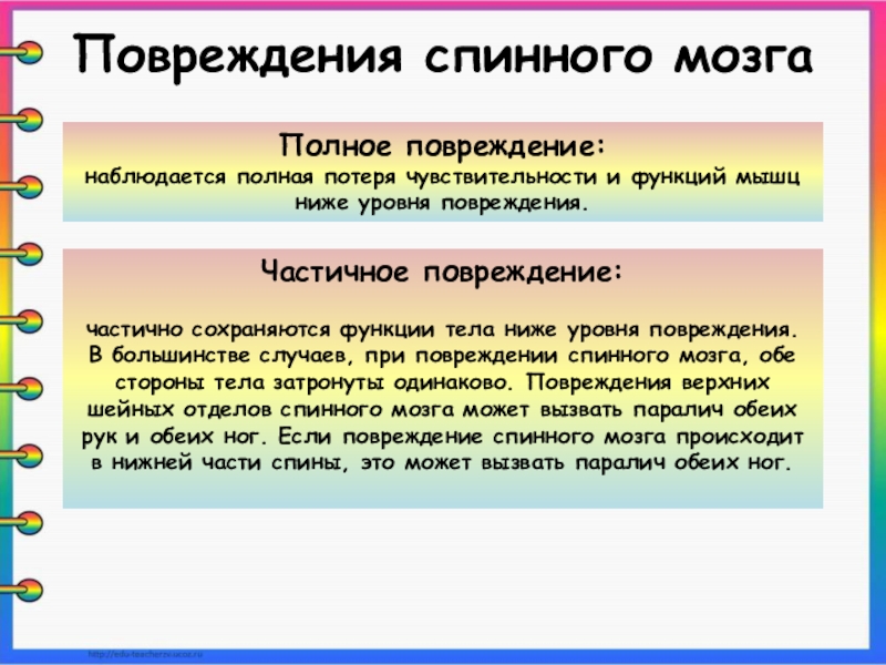 В большинстве случаев, при повреждении спинного мозга, обе стороны тела затронуты одинаково. Повреждения верхних шейных отделов спинного мозга может вызвать паралич обеих рук и обеих ног. Если повреждение спинного мозга происходит в нижней части спины, это может вызвать паралич обеих ног.