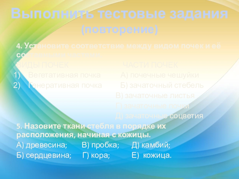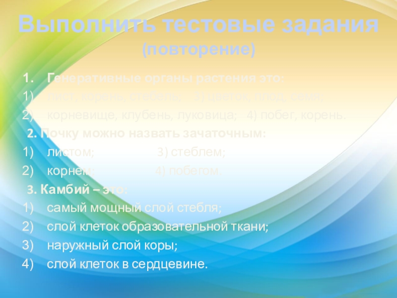 Выполнить тестовые задания (повторение)Генеративные органы растения это:лист, корень, стебель; 3) цветок, плод, семя;корневище, клубень, луковица; 4) побег, корень.2. Почку можно назвать зачаточным:листом; 3) стеблем;корнем;