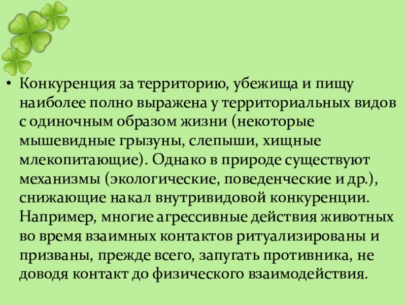 Слайд 26Конкуренция за территорию, убежища и пищу наиболее полно выражена у территориальных