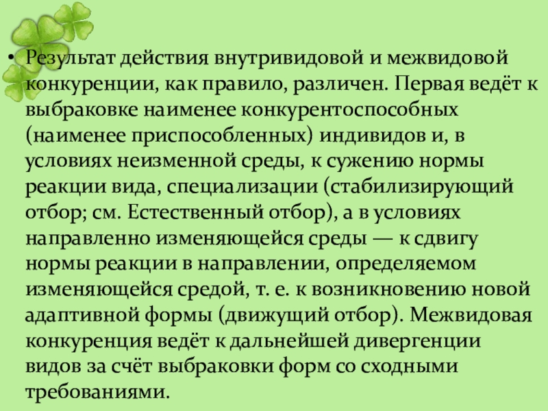 к выбраковке наименее конкурентоспособных (наименее приспособленных) индивидов и, в условиях неизменной среды, к сужению нормы реакции вида, специализации (стабилизирующий отбор; см. Естественный отбор), а в условиях направленно изменяющейся среды — к сдвигу нормы реакции в направлении, определяемом изменяющейся средой, т. е. к возникновению новой адаптивной формы (движущий отбор). Межвидовая конкуренция ведёт к дальнейшей дивергенции видов за счёт выбраковки форм со сходными требованиями.
