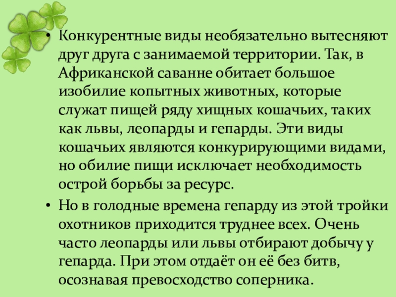 Африканской саванне обитает большое изобилие копытных животных, которые служат пищей ряду хищных кошачьих, таких как львы, леопарды и гепарды. Эти виды кошачьих являются конкурирующими видами, но обилие пищи исключает необходимость острой борьбы за ресурс.