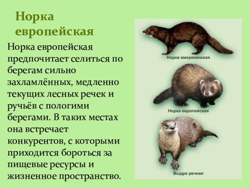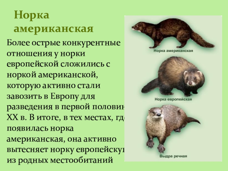 американской, которую активно стали завозить в Европу для разведения в первой половине XX в. В итоге, в тех местах, где появилась норка американская, она активно вытесняет норку европейскую из родных местообитаний