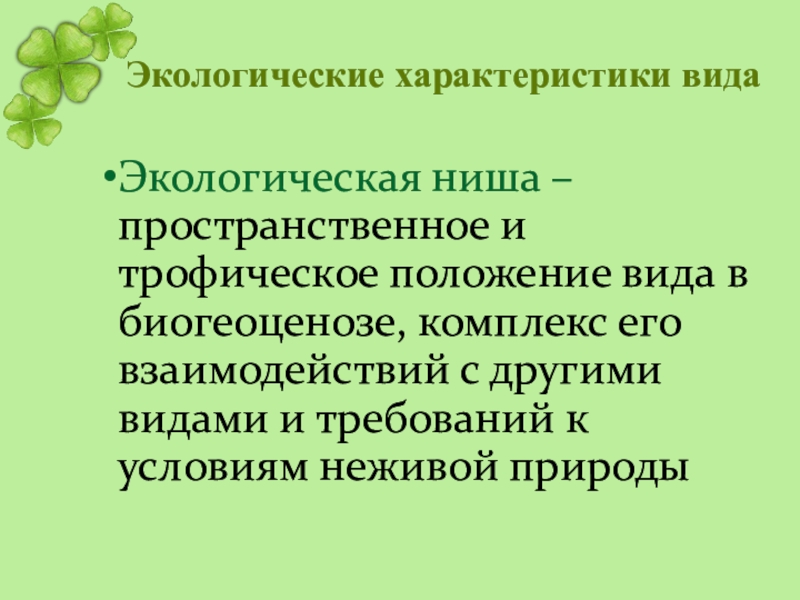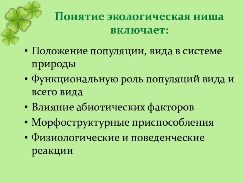 условиям окружающей среды (включая занимаемое им пространство и функциональную роль в сообществе), при которых возможно существование вида в природе.