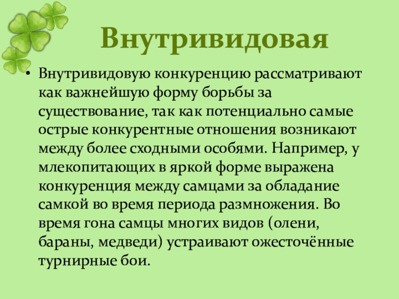 Внутривидовую конкуренцию рассматривают как важнейшую форму борьбы за существование, так как