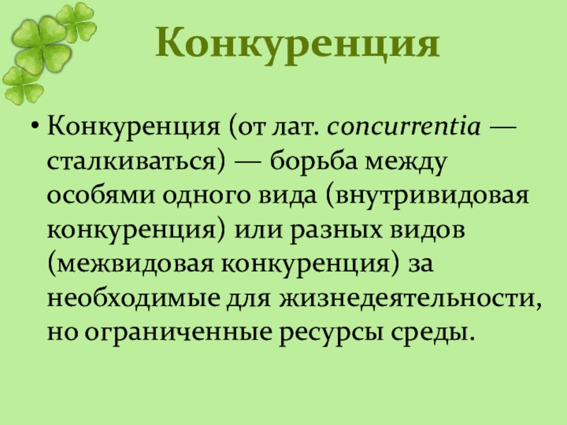 Слайд 10Конкуренция (от лат. concurrentia — сталкиваться) — борьба между особями одного вида (внутривидовая