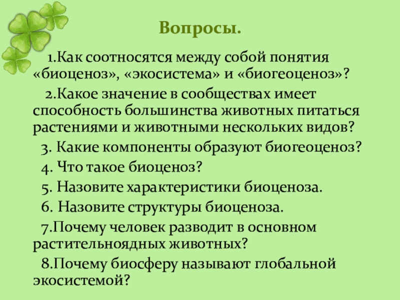 1.Как соотносятся между собой понятия «биоценоз», «экосистема»