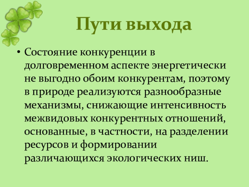 поэтому в природе реализуются разнообразные механизмы, снижающие интенсивность межвидовых конкурентных отношений, основанные, в частности, на разделении ресурсов и формировании различающихся экологических ниш.
