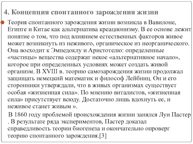 Вавилоне, Египте и Китае как альтернатива креационизму. В ее основе лежит понятие о том, что под влиянием естественных факторов живое может возникнуть из неживого, органическое из неорганического. Она восходит к Эмпедоклу и Аристотелю: определенные «частицы» вещества содержат некое «альтернативное начало», которое при определенных условиях может создать живой организм. В XVIII в. теорию самозарождения жизни продолжал защищать немецкий математик и философ Лейбниц. Он и его сторонники утверждали, что в живых организмах существует особая «жизненная сила». По мнению виталистов, «жизненная сила» присутствует всюду. Достаточно лишь вдохнуть ее, и неживое станет живым ».