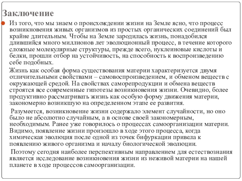 что процесс возникновения живых организмов из простых органических соединений был крайне длительным. Чтобы на Земле зародилась жизнь, понадобился длившийся много миллионов лет эволюционный процесс, в течение которого сложные молекулярные структуры, прежде всего, нуклеиновые кислоты и белки, прошли отбор на устойчивость, на способность к воспроизведению себе подобных.