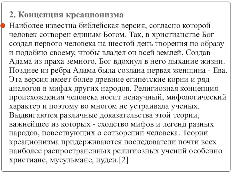 сотворен единым Богом. Так, в христианстве Бог создал первого человека на шестой день творения по образу и подобию своему, чтобы владел он всей землей. Создав Адама из праха земного, Бог вдохнул в него дыхание жизни. Позднее из ребра Адама была создана первая женщина - Ева. Эта версия имеет более древние египетские корни и ряд аналогов в мифах других народов. Религиозная концепция происхождения человека носит ненаучный, мифологический характер и поэтому во многом не устраивала ученых. Выдвигаются различные доказательства этой теории, важнейшее из которых - сходство мифов и легенд разных народов, повествующих о сотворении человека. Теории креационизма придерживаются последователи почти всех наиболее распространенных религиозных учений особенно христиане, мусульмане, иудеи.[2]