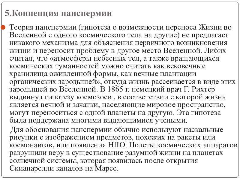 с одного космического тела на другие) не предлагает никакого механизма для объяснения первичного возникновения жизни и переносит проблему в другое место Вселенной. Либих считал, что «атмосферы небесных тел, а также вращающихся космических туманностей можно считать как вековечные хранилища оживленной формы, как вечные плантации органических зародышей», откуда жизнь рассеивается в виде этих зародышей во Вселенной. В 1865 г. немецкий врач Г. Рихтер выдвинул гипотезу космозоев , в соответствии с которой жизнь является вечной и зачатки, населяющие мировое пространство, могут переноситься с одной планеты на другую. Эта гипотеза была поддержана многими выдающимися учеными.