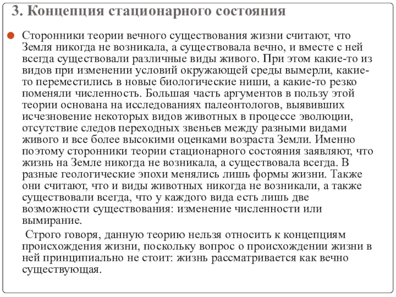 не возникала, а существовала вечно, и вместе с ней всегда существовали различные виды живого. При этом какие-то из видов при изменении условий окружающей среды вымерли, какие-то переместились в новые биологические ниши, а какие-то резко поменяли численность. Большая часть аргументов в пользу этой теории основана на исследованиях палеонтологов, выявивших исчезновение некоторых видов животных в процессе эволюции, отсутствие следов переходных звеньев между разными видами живого и все более высокими оценками возраста Земли. Именно поэтому сторонники теории стационарного состояния заявляют, что жизнь на Земле никогда не возникала, а существовала всегда. В разные геологические эпохи менялись лишь формы жизни. Также они считают, что и виды животных никогда не возникали, а также существовали всегда, что у каждого вида есть лишь две возможности существования: изменение численности или вымирание.