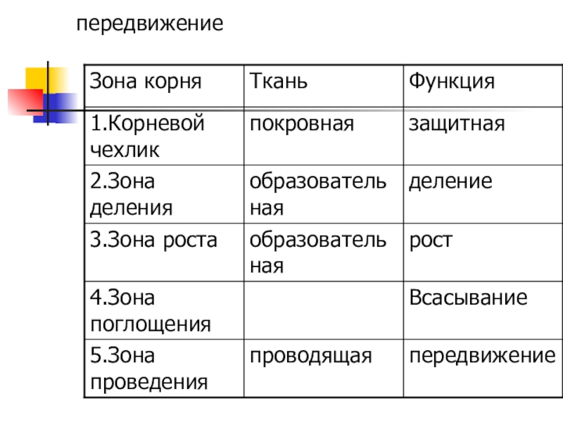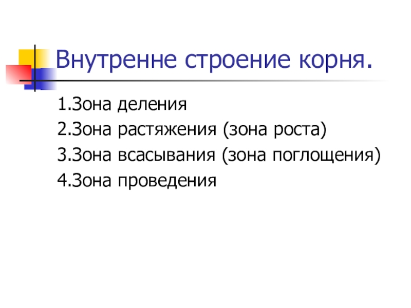 Внутренне строение корня.1.Зона деления2.Зона растяжения (зона роста)3.Зона всасывания (зона поглощения)4.Зона проведения