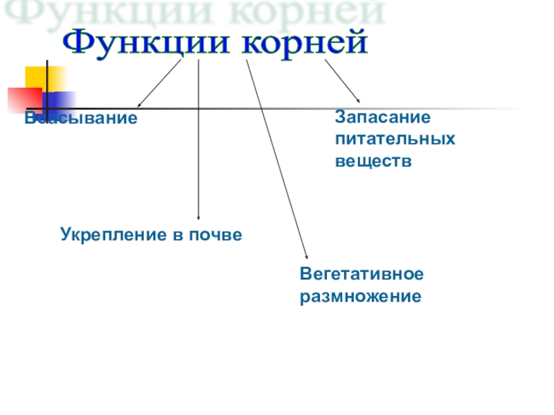 Функции корнейВсасываниеУкрепление в почвеВегетативное размножениеЗапасаниепитательныхвеществ