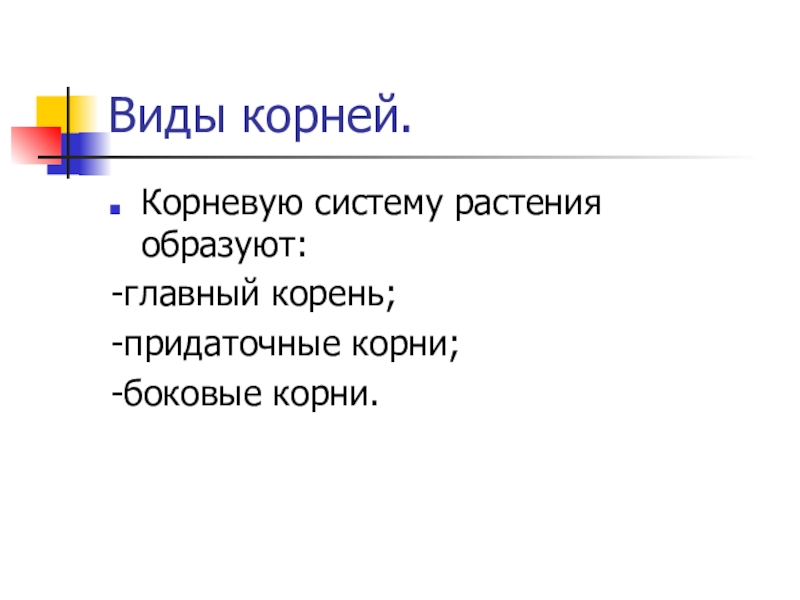 Виды корней.Корневую систему растения образуют:-главный корень;-придаточные корни;-боковые корни.