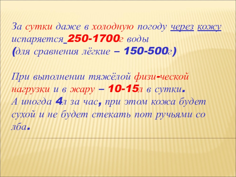 Слайд 9За сутки даже в холодную погоду через кожу испаряется 250-1700г воды