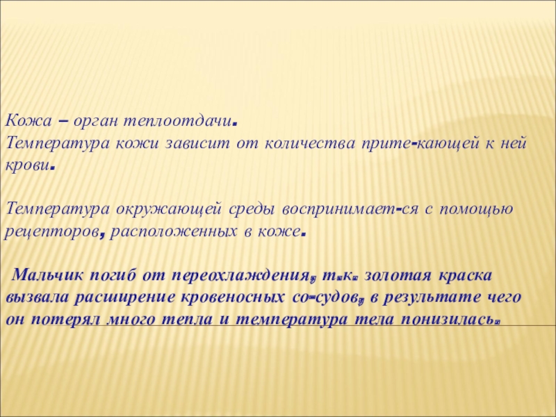 Мальчик погиб от переохлаждения, т.к. золотая краска вызвала расширение кровеносных со-судов, в результате чего он потерял много тепла и температура тела понизилась.